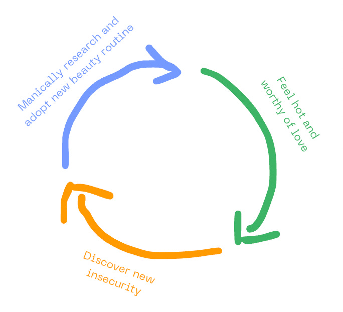 The goalpost for being the best, most attractive version of myself changes with everything I learn. I go from feeling beautiful to panicking about a technique I’ve been doing “wrong” or how stupid I am for not knowing my ideal nose contour shape or whatever the hell it is that week.
