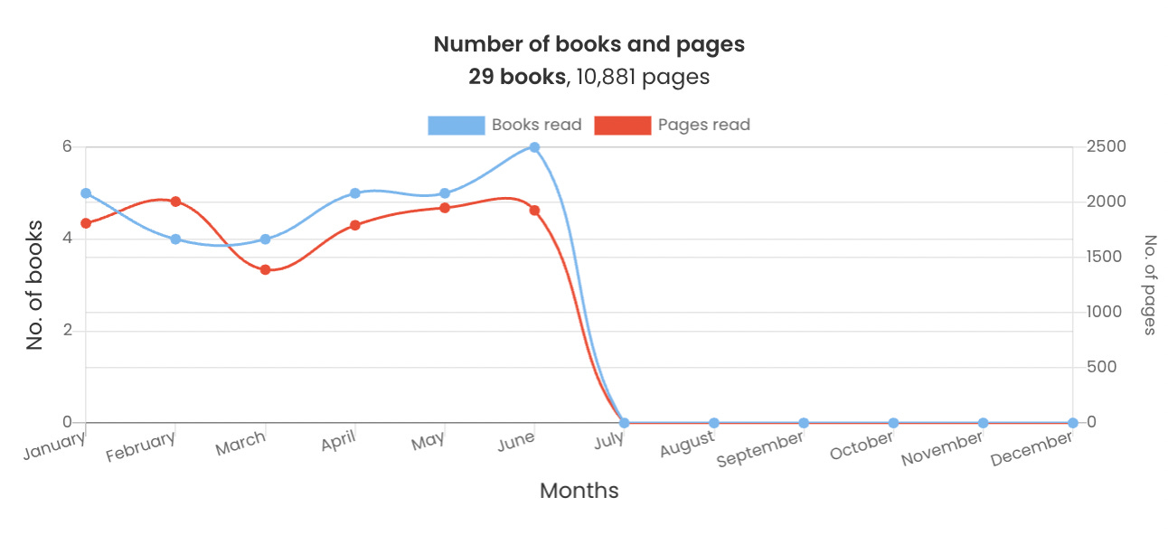 I love the StoryGraph chart that logs how many pages vs. books I read in a month. Summer is always hit or miss for me with reading, so weāll see how squiggly these lines end upā¦