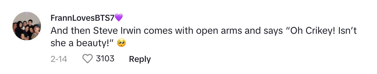 I don’t even think there’s an afterlife, but the thought of Steve Irwin greeting this butt-ugly fish like she’s the most stunning creature he’s ever seen in heaven is enough to make me a believer.