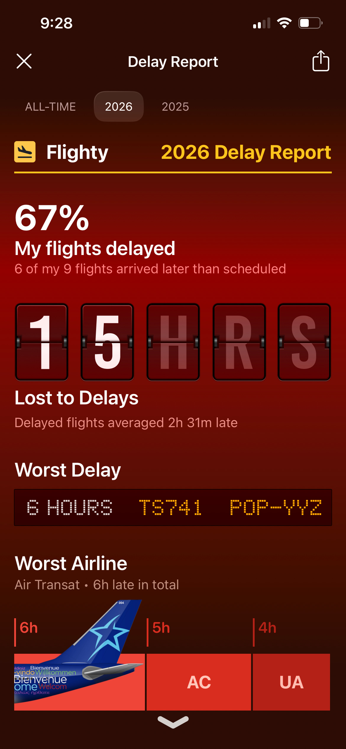 My friend shared an app with me called Flighty, which is essentially Spotify Wrapped for travel. It tracks your flights and creates fun stats about distance travelled, time in the air, and airline performance.