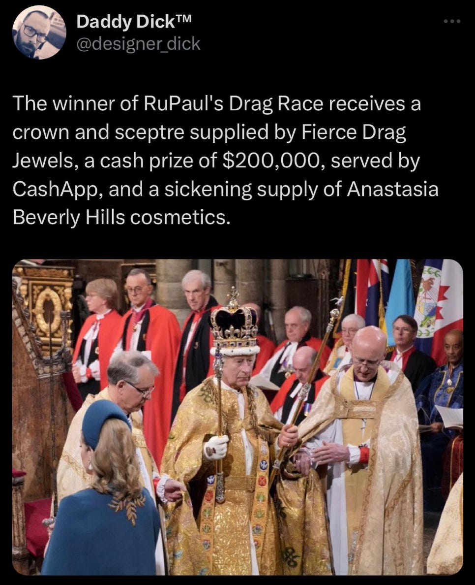 Comparatively, the coronation was a blip on my radar. All that paraded through my timeline was a slow-mo video of Kate Middleton set to “Miracles Happen” and a long list of satirical memes (including this gem).