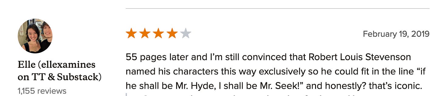 Anyway, for a book about a doctor who split himself in two via potion, a lot of these pages are focused on his will and estate. Property law is, and will always be horror fodder (see also: Wuthering Heights, Dracula, Bleak House, A Christmas Carol, etc.) A disfigured beast will be murdering people for sport, but 1800s novelists will spend 25-50% of the book discussing contracts. I guess those are scary, too…