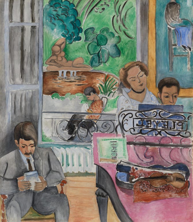 The mustached man from Matisse’s The Music Lesson (below) falls in love with a down-on-her-luck janitor. A Harold and the Purple Crayon-style romance ensues. It could have been cute (who wouldn’t love to run through famous paintings all night???), but I was mostly bored. A LOT of the plot was lamenting, yearning, and generally not communicating.