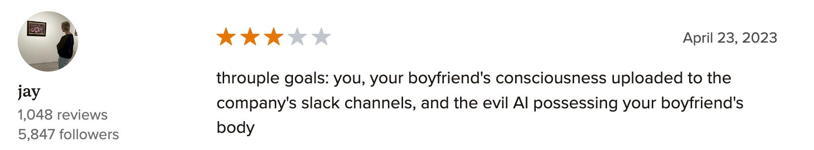 This was delightful! Weird!!! Existential!!!