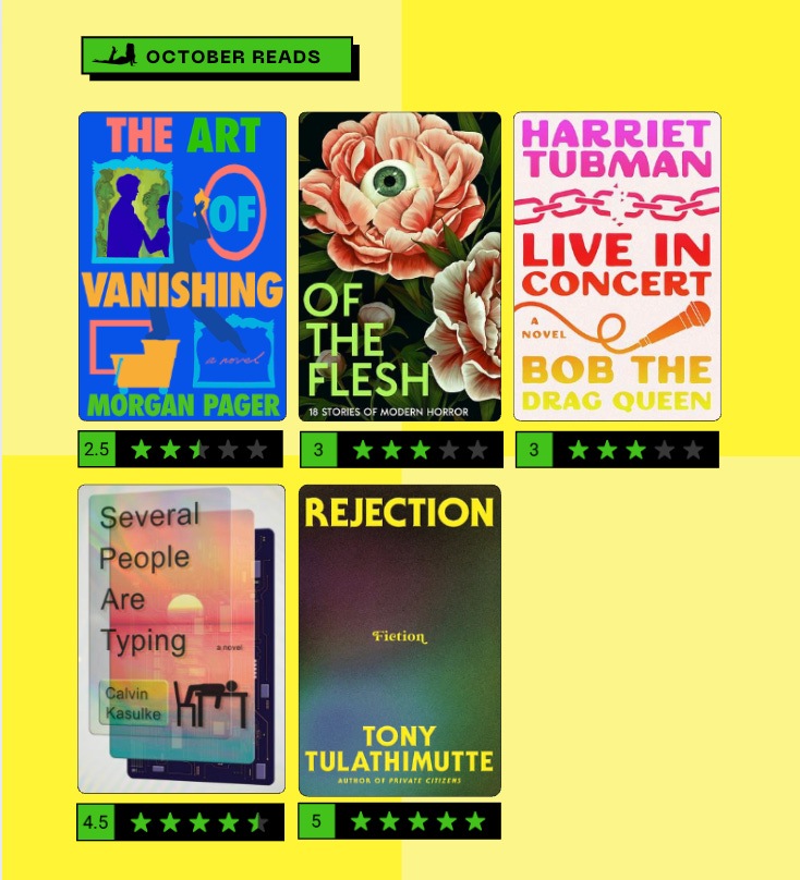 If there’s one thing I love, it’s a batshit crazy premise. Bob delivered; however, I don’t think this went far enough! I never felt like I really got inside the main character’s mind and emotions, which I could have overlooked with more wacky antics. Who is Harriet following on Instagram? How does she feel about Labubus?? Facelifts?? The WNBA?!? Ultimately, this felt more like a screenplay than a novel, especially since Bob produced two original songs as Harriet Tubman for the audiobook. Hello!?! Put this on Broadway ASAP!